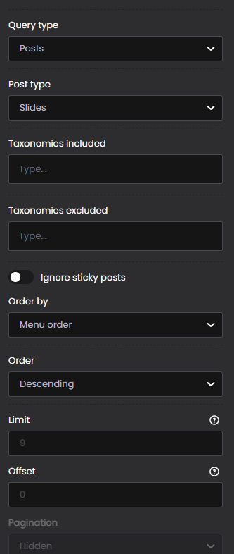 I intend to create a slider using the following method: section, queery loop, dynamic data (from slides I've created from the WPadmin), up until that point, everything works nicely, however, my main issue is that I can't find any option to filter the slider by using the categories I created in the slides section, and it's just showing every slide, wich I don't want.