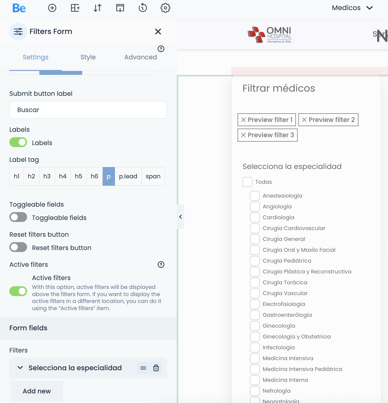 Now I need to add a field to filter doctors by name. I'm not able to find an option of element to achieve that. Could you give guidelines to set this feature?