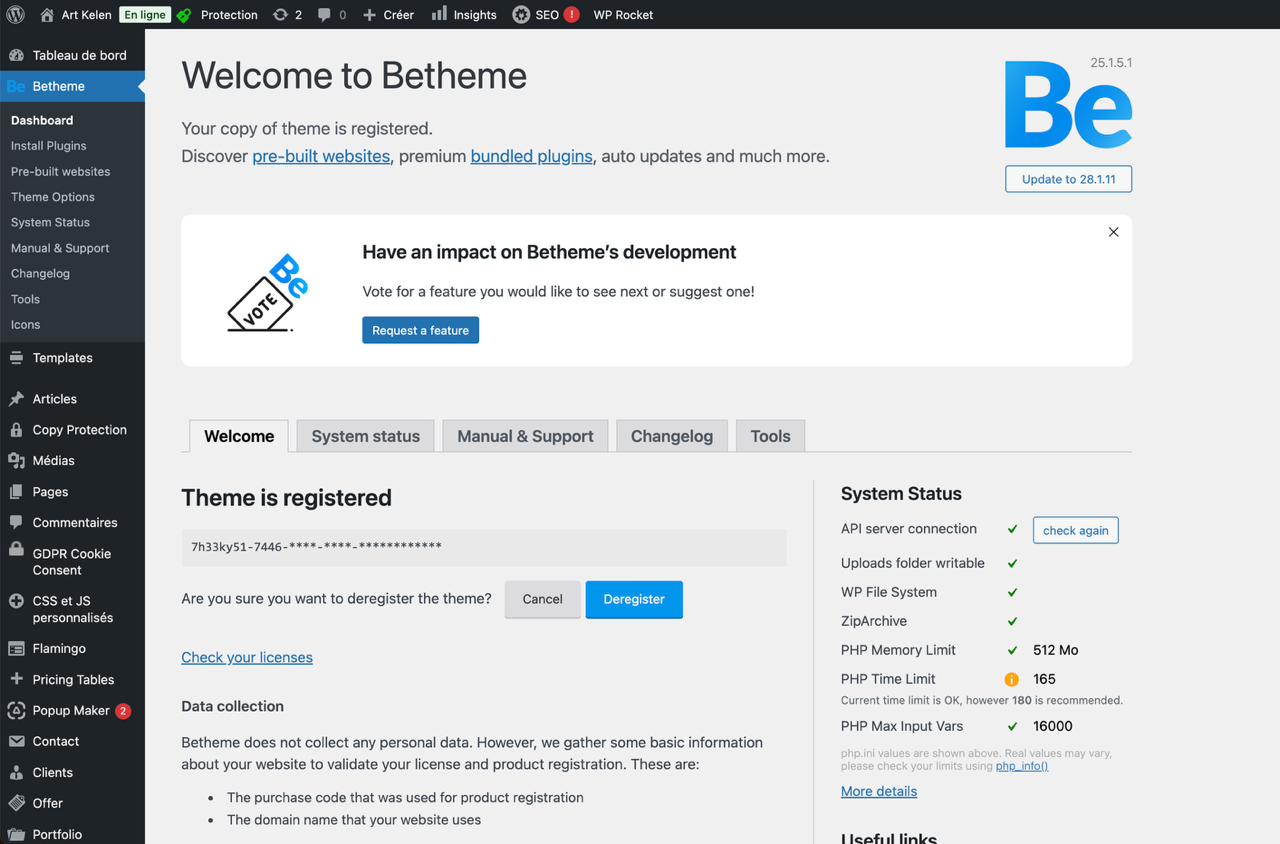 The webdesigner who built my website registered his Betheme license on my website but it is now expired and I cannot update my theme because of that. I have bought a new Betheme license myself but I need help to deregister the old one (when I click on the « Deregister » button nothing happens) and register the new one instead on my website. I have kept the same URL and Domain name.