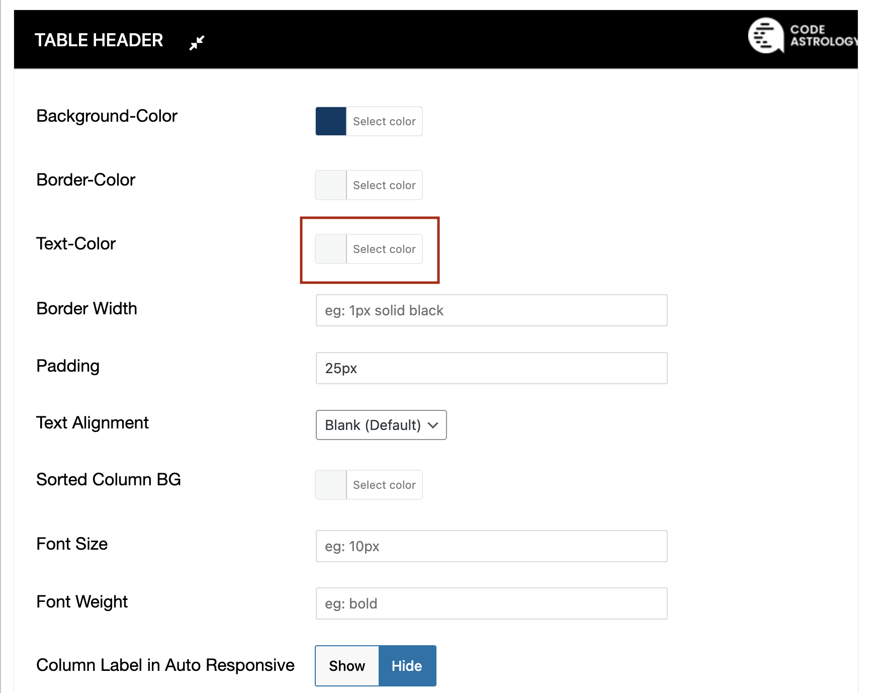 Here table header style settings