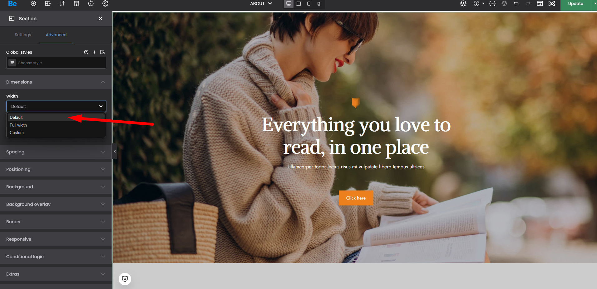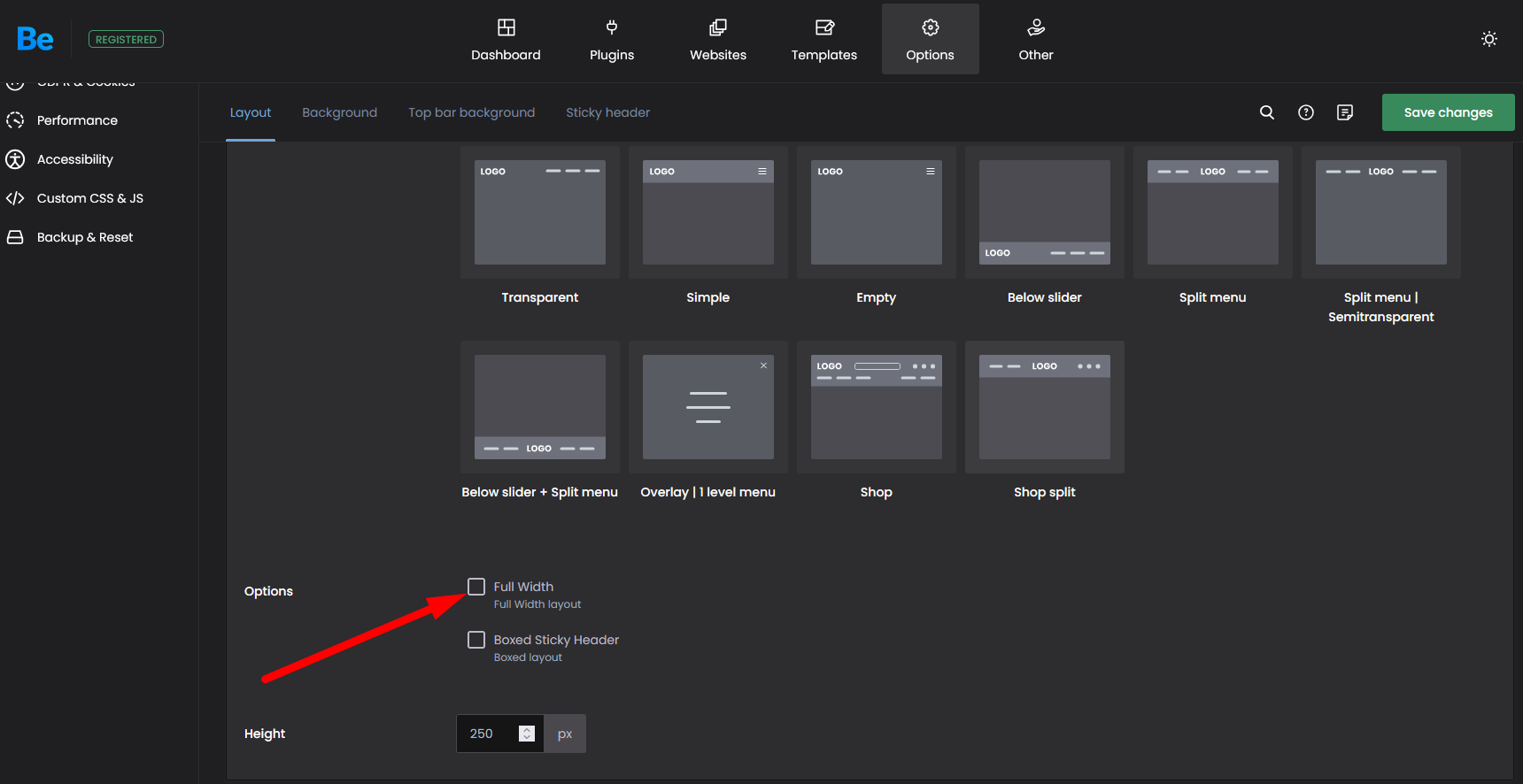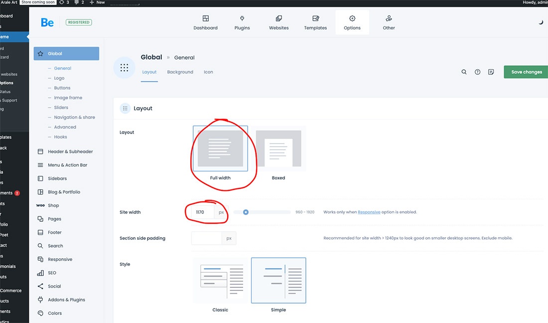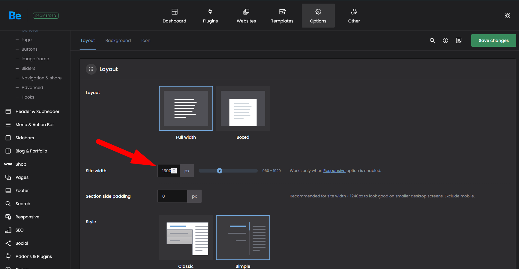 • Right below the Layout option, you can find the Site width, so you can adjust the width to what you need.