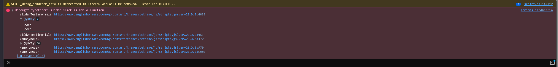 j'ai fait une petite investigation et le script qui fait appel à slider.slick est chargé après le fichier slick.min.js