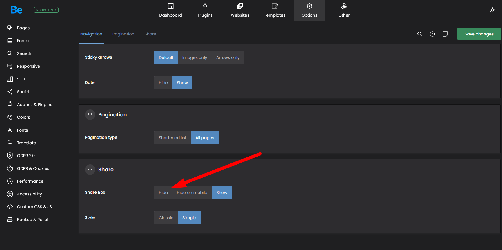2.) At the bottom of each individual post, there is a share button for various social media platforms. I want to remove this. How can I do this?