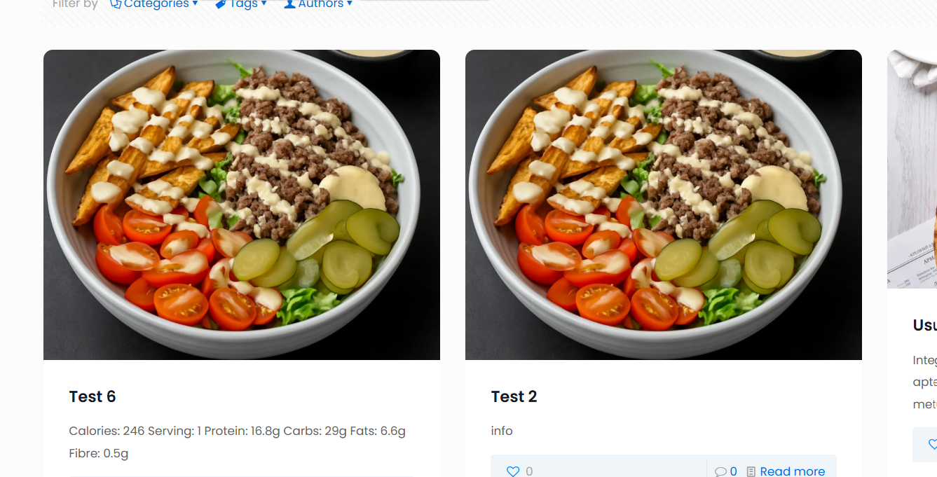 In your place, I would use a template for that, build the list using Query Loop, and display these texts using ACF. With ACF, you can create custom fields for calories, protein, etc., and then display them in Query Loop in Archive with the dynamic data.