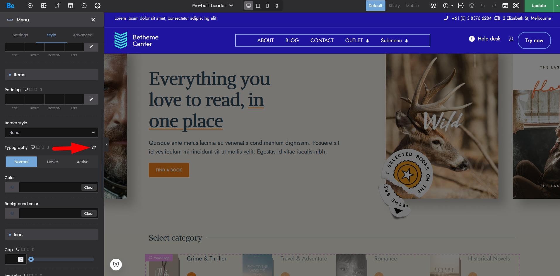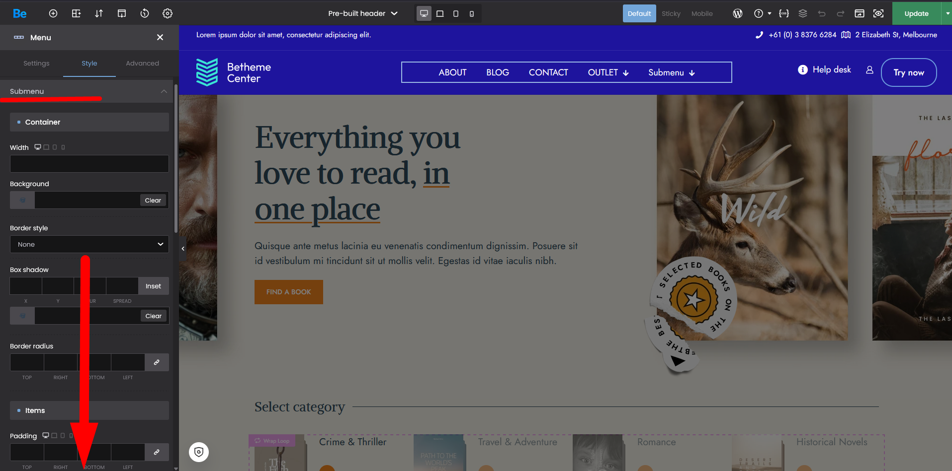 There are typography options for the submenu in the same Style tab: